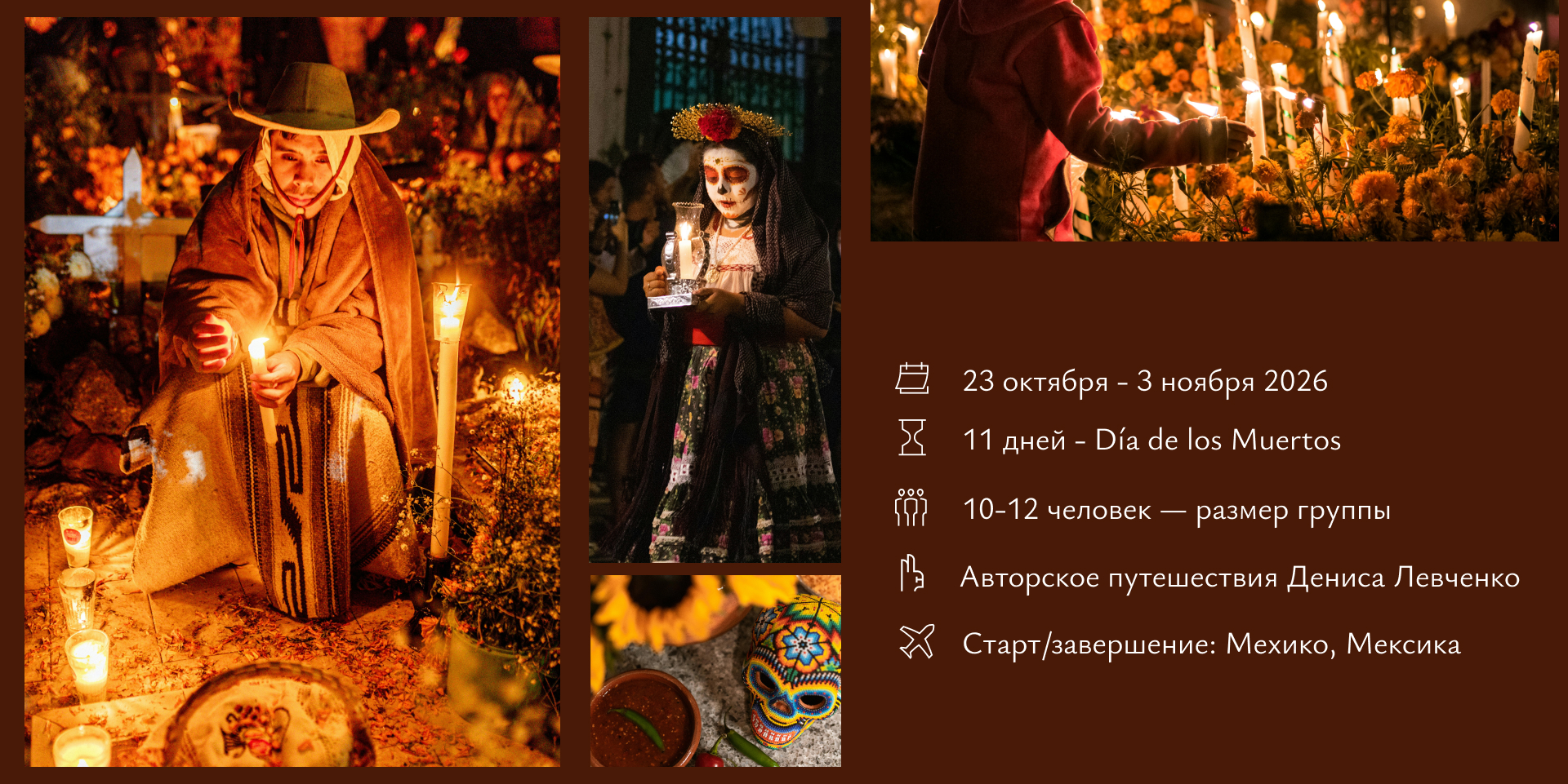 - Авторские лекции об истории Мексики, колониальных войнах и доколумбовых цивилизациях. Встречи с местными мастерами и хранителями традиций.